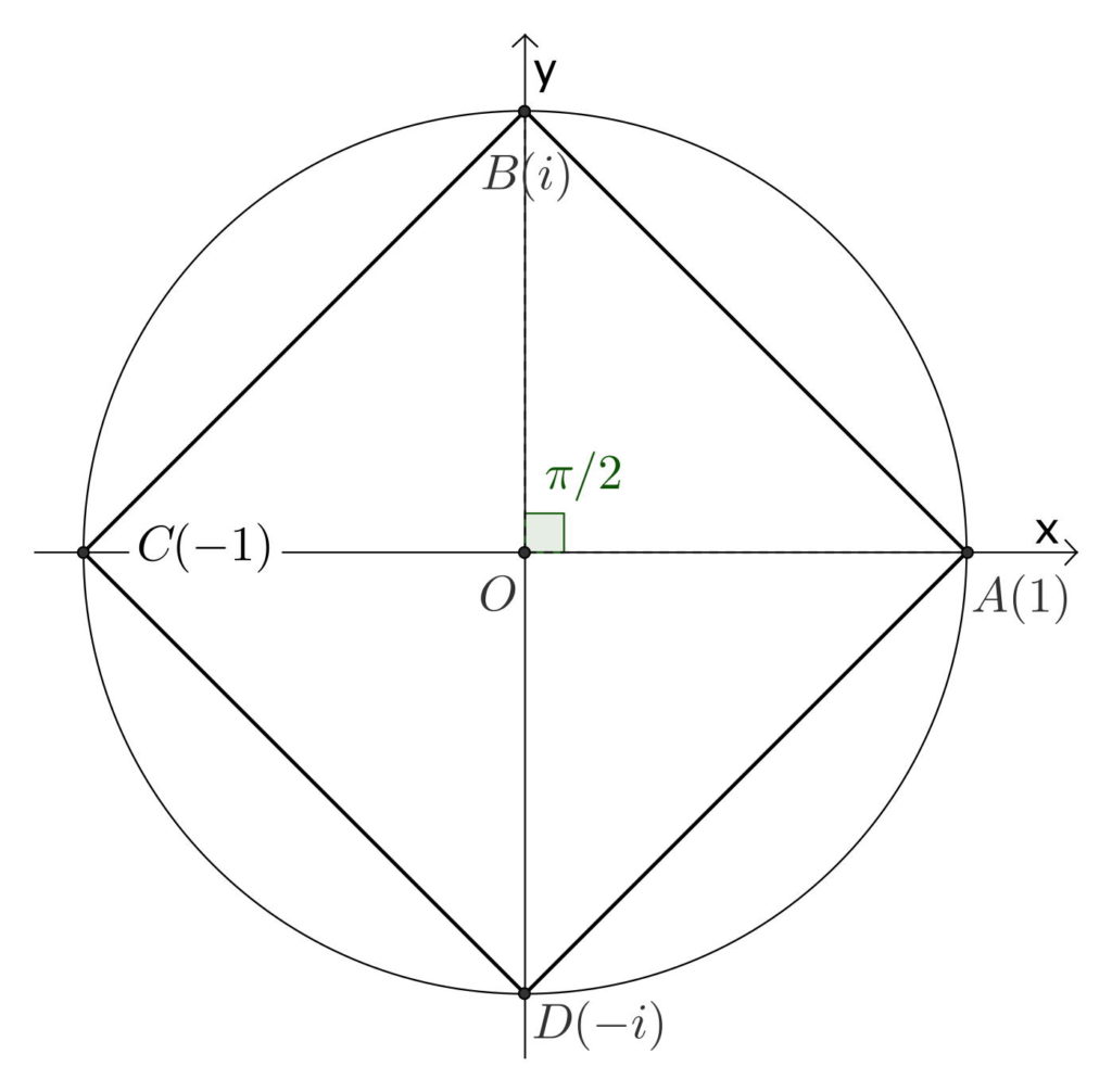 - Les racines quatrièmes de l’unité sont: {1,i,-1,-i} (donc {\mathcal{U}_{4}=\{1,i,-1,-i\}}).